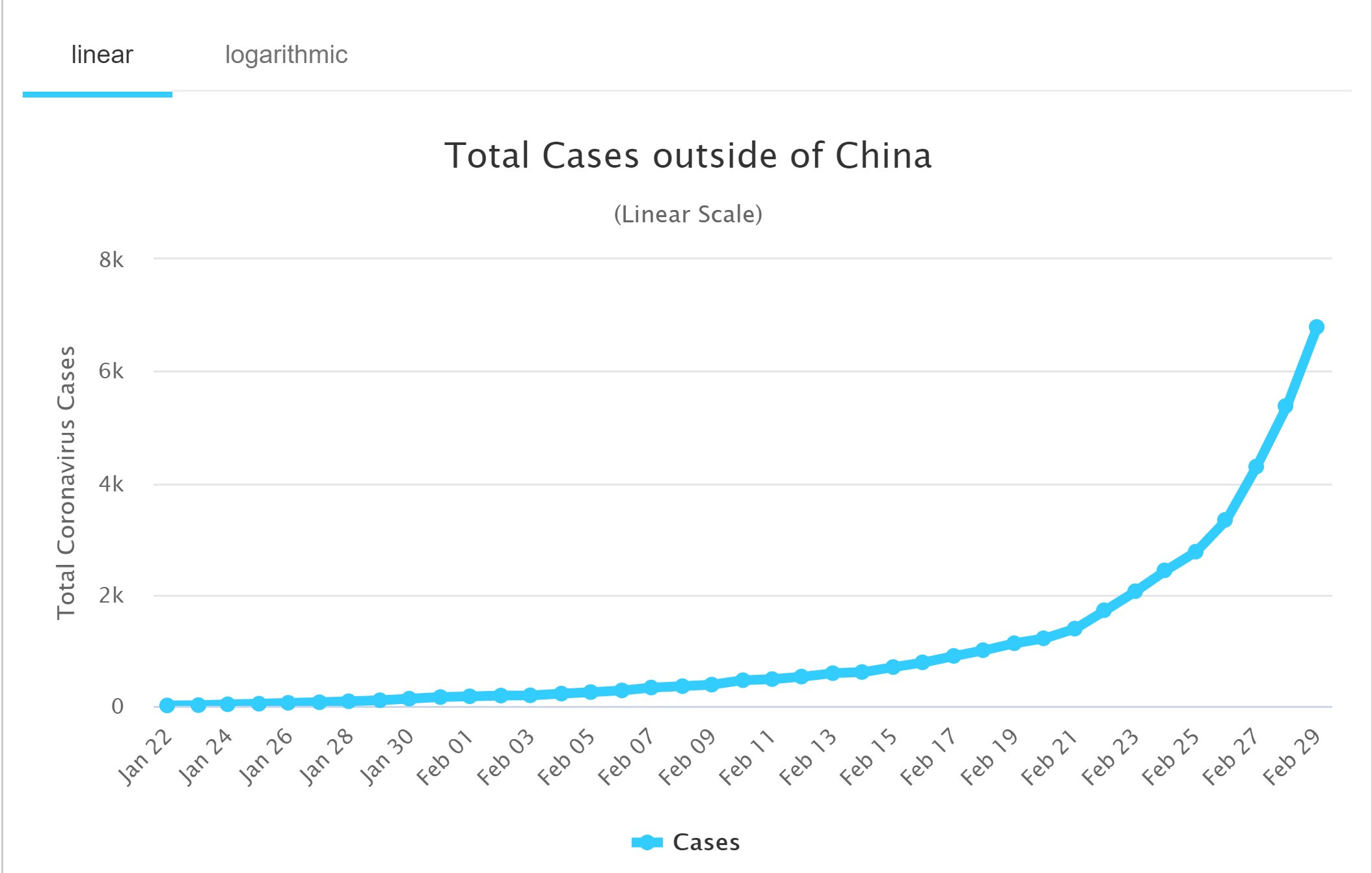 It’s not a China problem. It’s a global problem. The number of confirmed cases still small, but growing at an exponential clip.